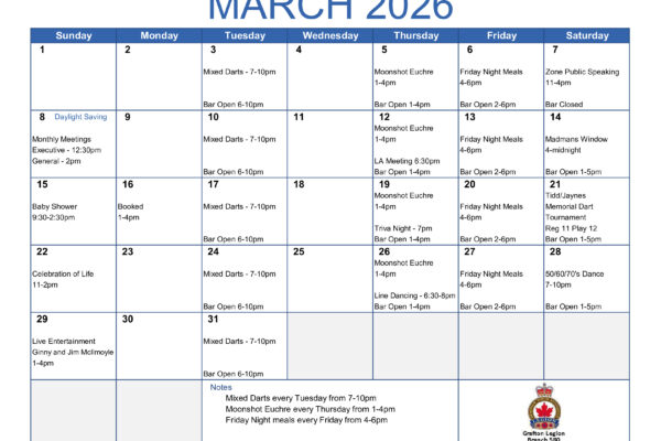 Here is our new calendar of events for March on what is happening at the Grafton Legion. With our normal weekly activities of Mixed Darts, Moonshot Euchre and Friday Night Meals, we have: -Zone F2 Public Speaking on the 7th-Branch …