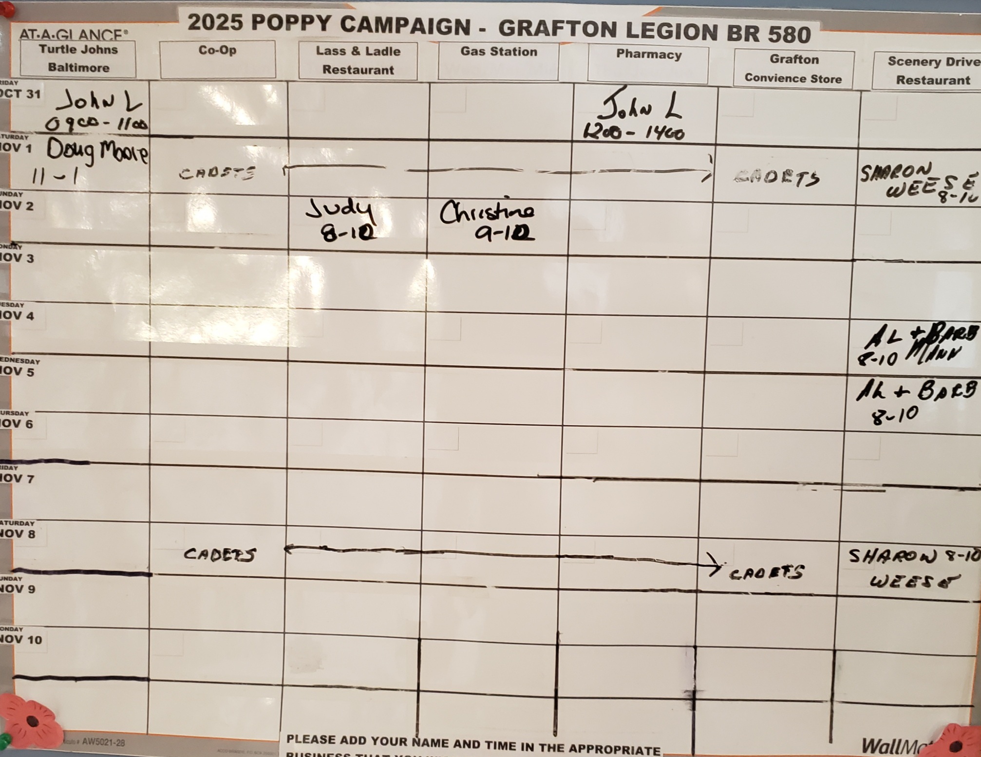 When you are in please review the Poppy Campaign sign-up sheet to assist in this years Campaign. You can sign up for the location and duration that works for your, but most pick to be out for 2 hours.